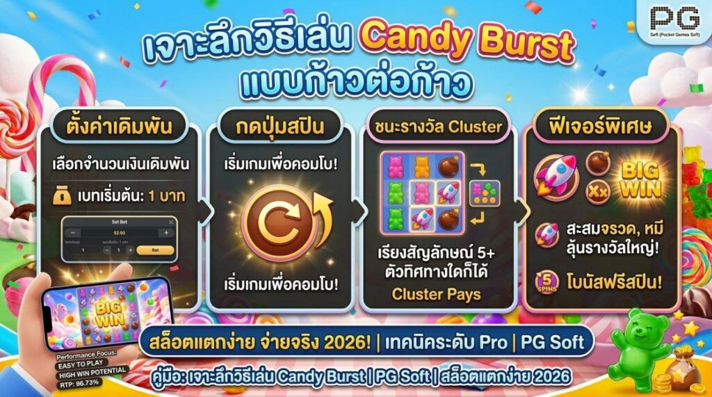 เริ่มต้นบทความด้วยการพาผู้อ่านไปรู้จักกับตัวเกมอย่างเป็นทางการ สล็อต Candy Burst PG เกมแตกหนัก เป็นเกมที่มีรูปแบบ 6×6 แถว ใช้ระบบการจ่ายเงินแบบ Cluster Pays ซึ่งแตกต่างจากสล็อตแบบเส้นจ่ายเงินทั่วไป คือขอแค่มีสัญลักษณ์เหมือนกันติดกัน 5 ตัวขึ้นไปในทิศทางใดก็ได้ก็ได้รางวัลแล้ว จุดเด่นของเกมนี้คือค่า RTP (Return to Player) ที่สูงถึง 96.73% และความผันผวนระดับปานกลาง ทำให้มีโอกาสชนะรางวัลอย่างต่อเนื่อง เหมาะทั้งกับมือใหม่และผู้เล่นมืออาชีพ