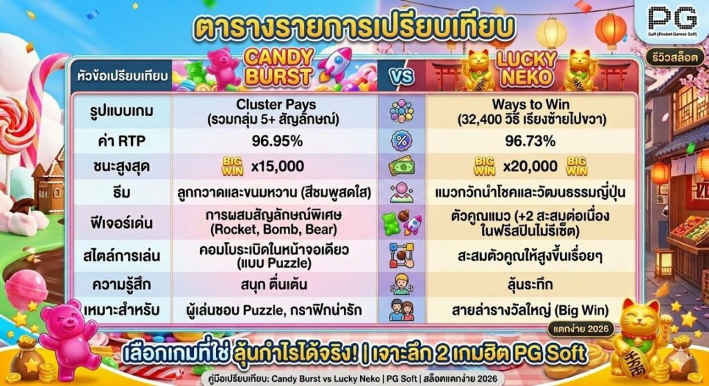 เปรียบเทียบระหว่าง Candy Burst และ Lucky Neko ถือว่าเป็นมวยคู่เอกของค่าย PG Soft เลยครับ เพราะทั้งสองเกมมีความนิยมสูงมาก แต่มี “จังหวะการจ่ายเงิน” และ “สไตล์การเล่น” ที่แตกต่างกันอย่างชัดเจน